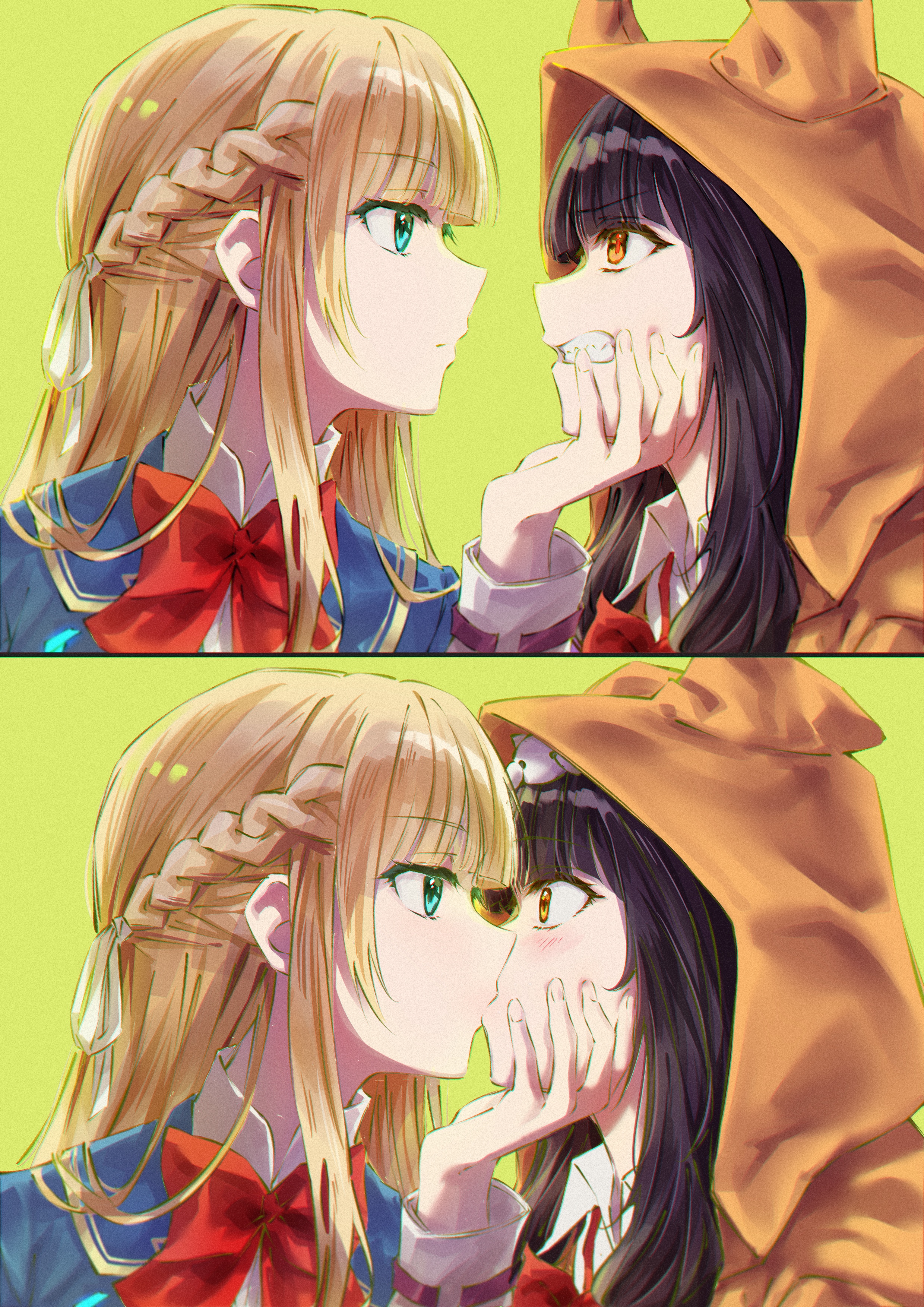2girlsaqua eyesblack hairblazerblonde hairblue jacketblunt bangsblushbowbowtiebraidclenched teethclosed mouthcollared shirteye contactgreen eyeshair ribbonhand on another's chinhoodhood uphooded jacketjacketkisslong hairlong sleeveslooking at anothermultiple girlsorange eyesred bowred bowtieribbonschool uniformshirtsidelocksteethwhite ribbonwhite shirtyellow eyesyuri