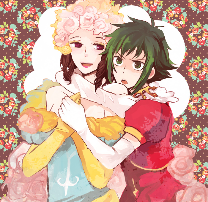 2girlsarm around neckbare shouldersbrown haircoupledresselbow glovesflowerglovesgreen eyesgreen hairlong hairmultiple girlsred eyesshort hairyuri