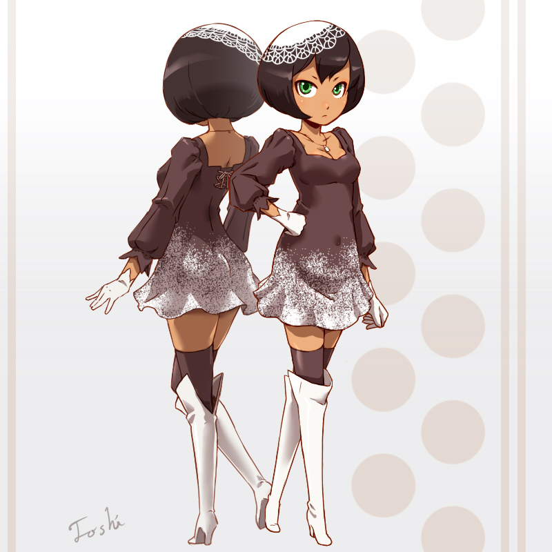 1girlblack hairbootsdark skindark-skinned femaledressfood-themed clothesglovesgreen eyeshand on own hiphigh heelship focusshoesshort hairthigh bootsthighhighs