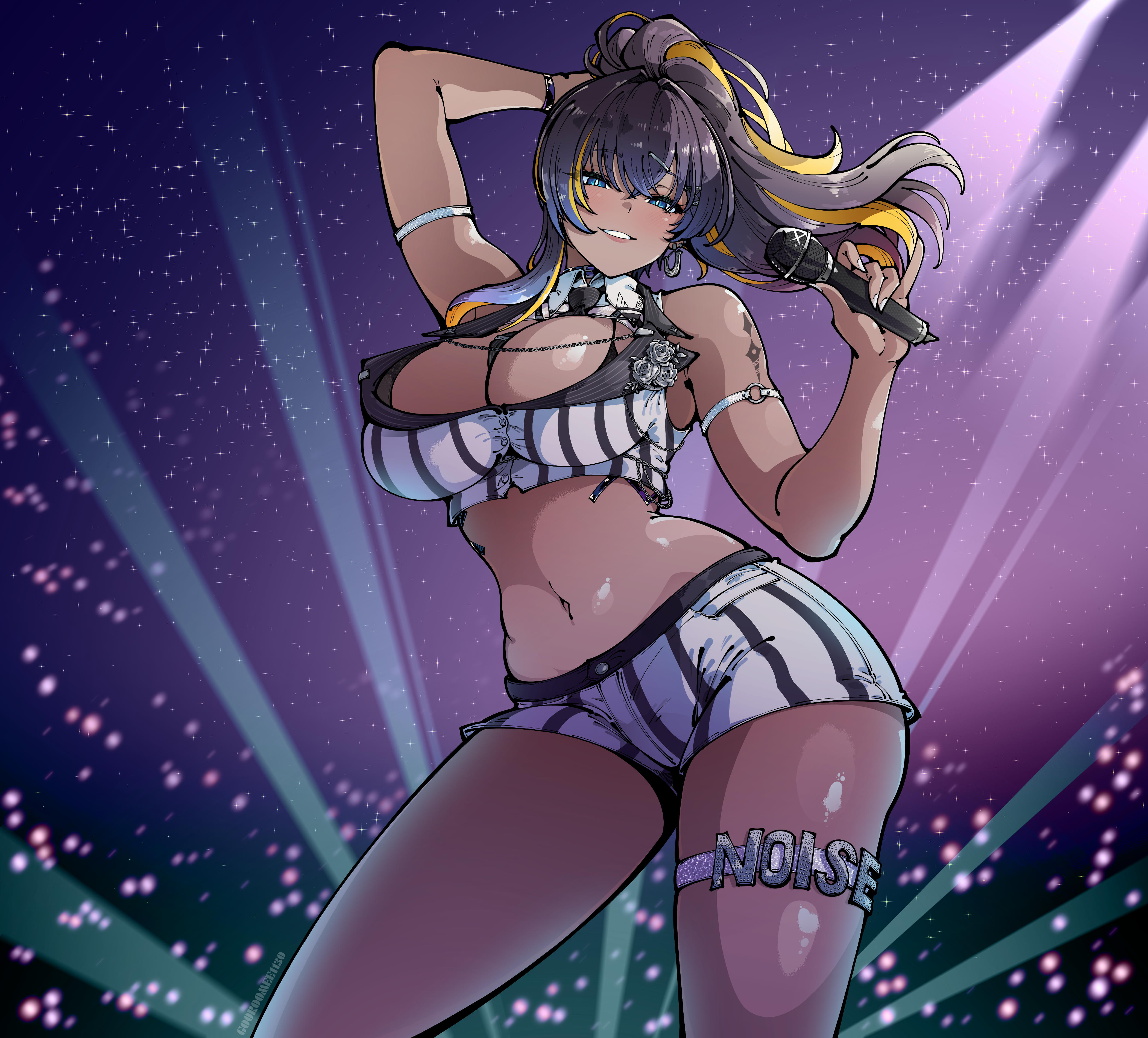 chigusa7h, scar (wuthering waves), wuthering waves, absurdres, commentary request, highres, 1boy, adam's apple, card, colored inner hair, crazy smile, cross, cross earrings, earrings, grey hair, hand on own neck, implied nudity, jewelry, looking at viewer, male focus, multicolored hair, open mouth, playing card, red hair, short hair, sideways, smile, solo, tacet mark (wuthering waves), tongue, tongue out, yellow eyes