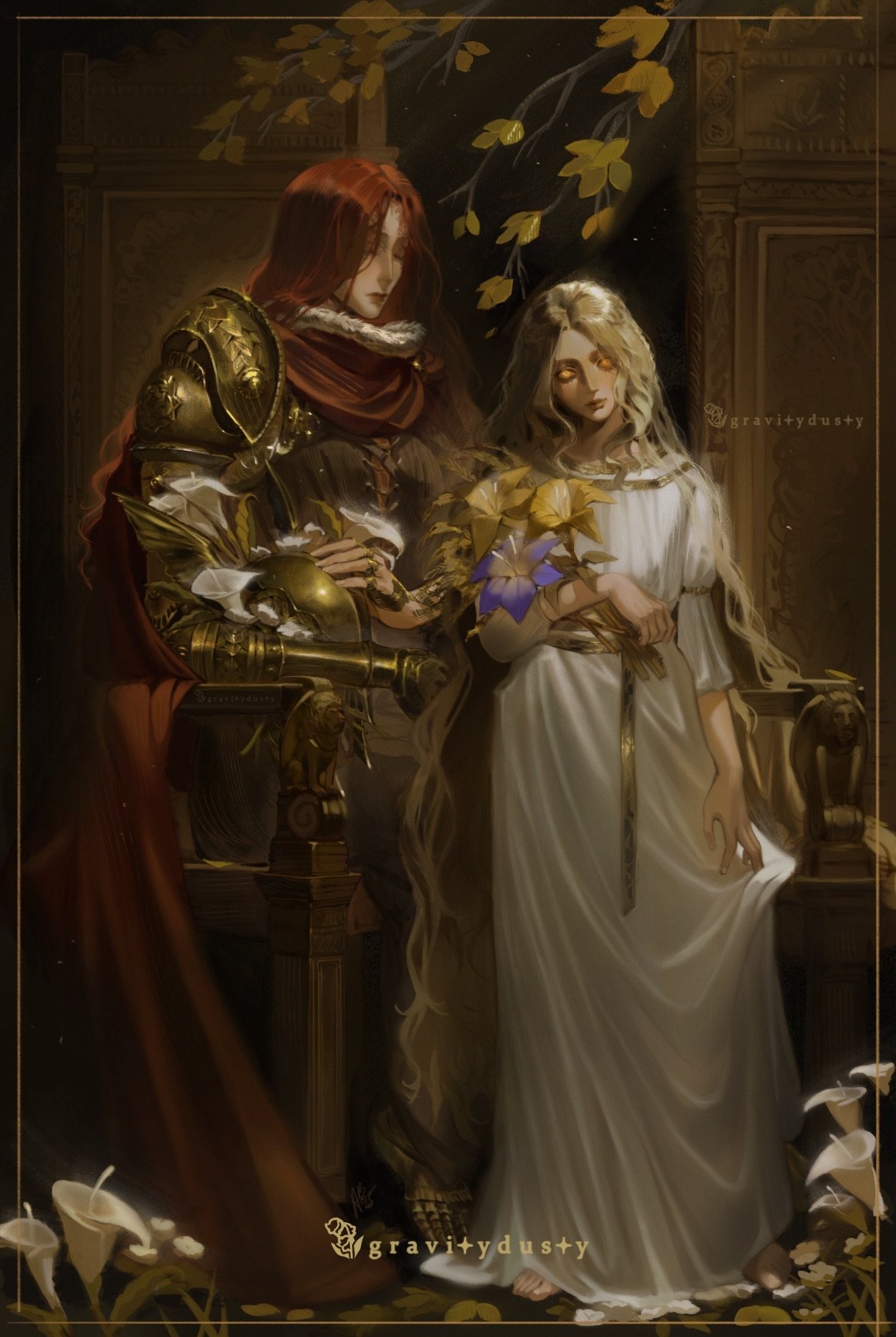 1boy1girlamputeearmorartist logoartist namebarefootblonde hairborderbranchbrother and sistercapeclosed eyesclosed mouthdressflowergold armorhelmetholdingholding unworn helmetleaflogolong hairprosthesisprosthetic armprosthetic legpurple flowerred capered hairsiblingssitting on thronethronetriple amputeetunicunworn headwearunworn helmetvery long hairwavy hairwhite flowerwhite tunicwinged helmetyellow eyesyellow flower