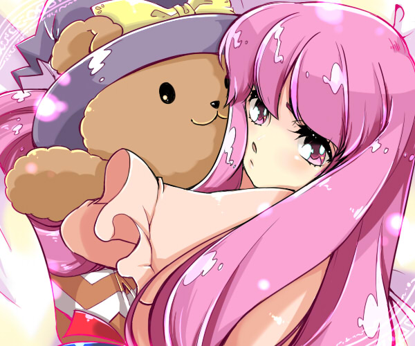 1girlfemale focushathat ribbonlong hairpurple eyespurple hairribbonsolostuffed animalstuffed toyteddy bearupper bodywitch hat