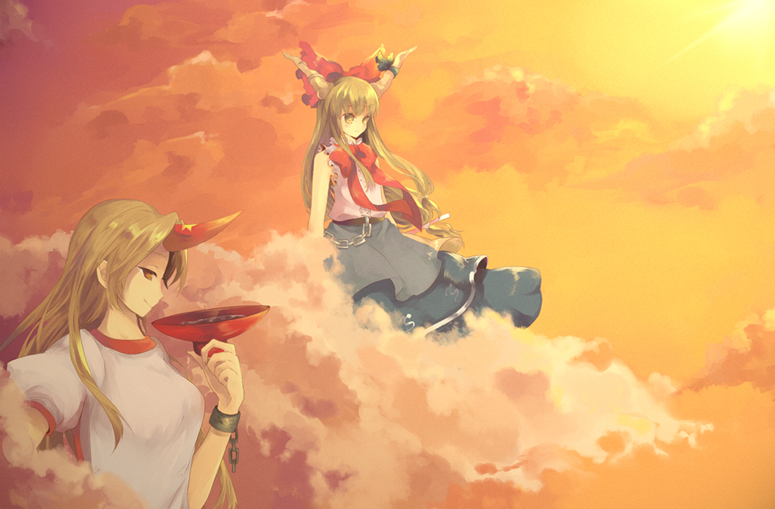 2girlsalcoholblonde hairchaincloudcupfemale focushornslong hairmultiple girlssakazukisakesingle hornsky