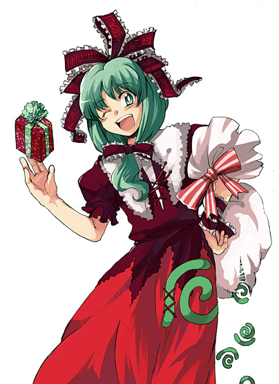 hinooka shuuji, suiseiseki, rozen maiden, translation request, 00s, brown hair, hat, heterochromia, long hair, santa hat, solo, strap slip, very long hair