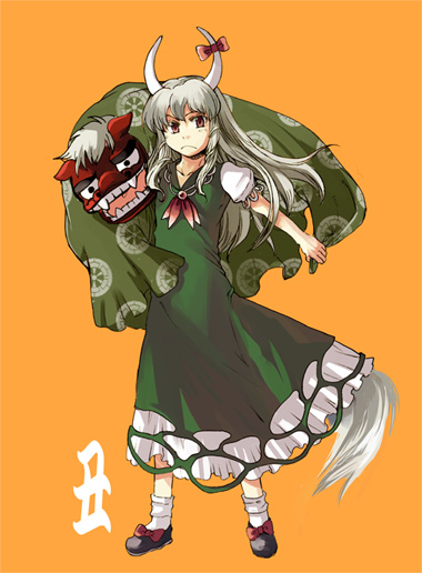 1girlbowfemale focusfootwear bowfrownfull bodyhornslion danceorange backgroundred eyesribbonshishimaisimple backgroundsockssolostandingtailwhite socks