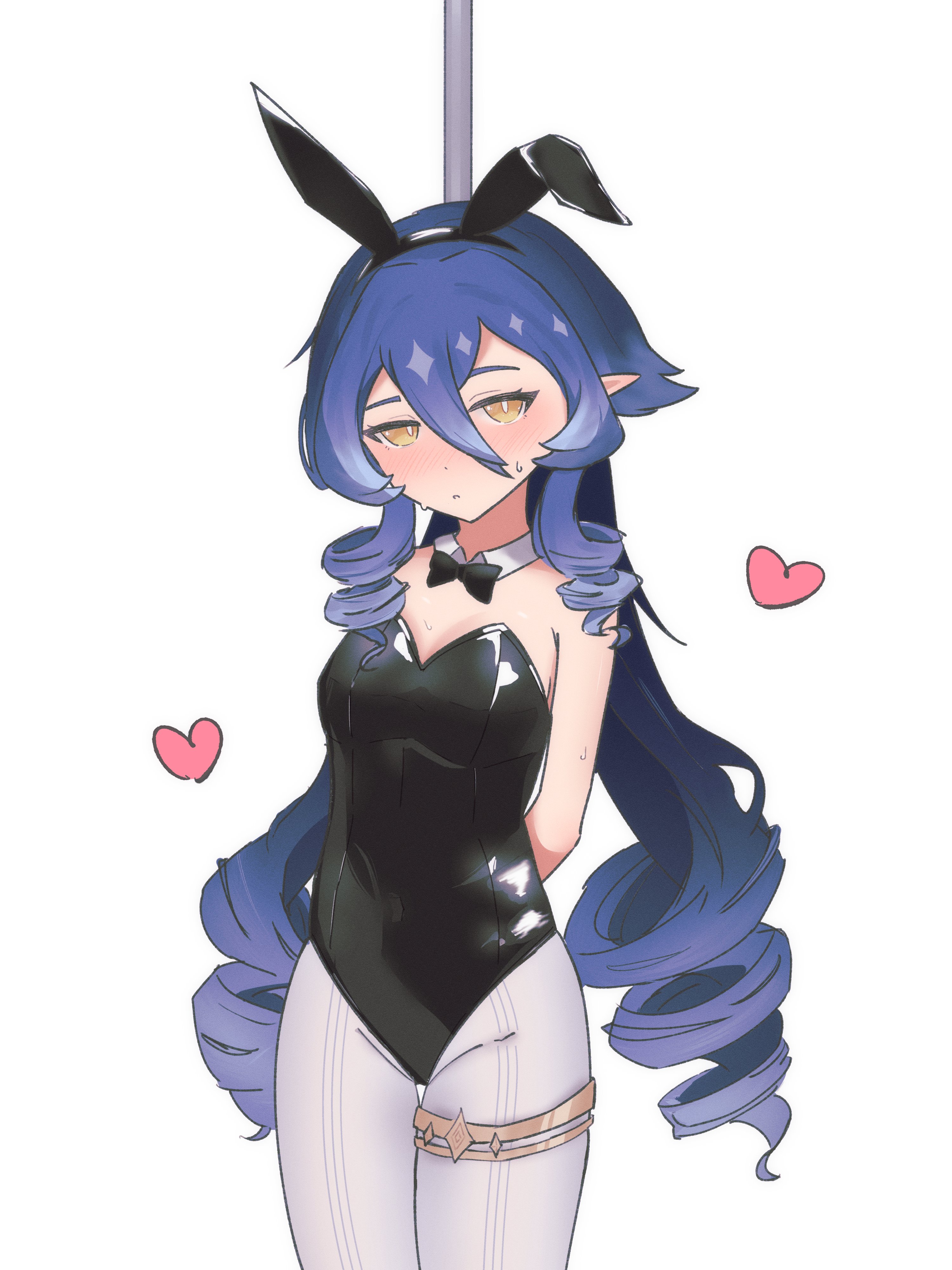 echocalypse, absurdres, artist request, highres, official art, 1girl, bare shoulders, bell, blue eyes, breasts, cleavage, elixia (echocalypse), flower, holding, large breasts, long hair, mask, mask on head, mole, mole on breast, neck bell, one eye closed, pillow, pink flower, platform sandals, purple hair, sandals, sleep mask, smile, socks, solo, tabi, tassel, thigh strap, white socks
