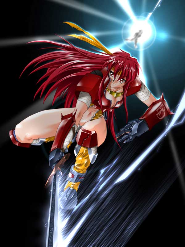 1girlarmorbreastscleavagefemale focuslarge breastslong hairred eyesred hairsmilesoloswordweapon