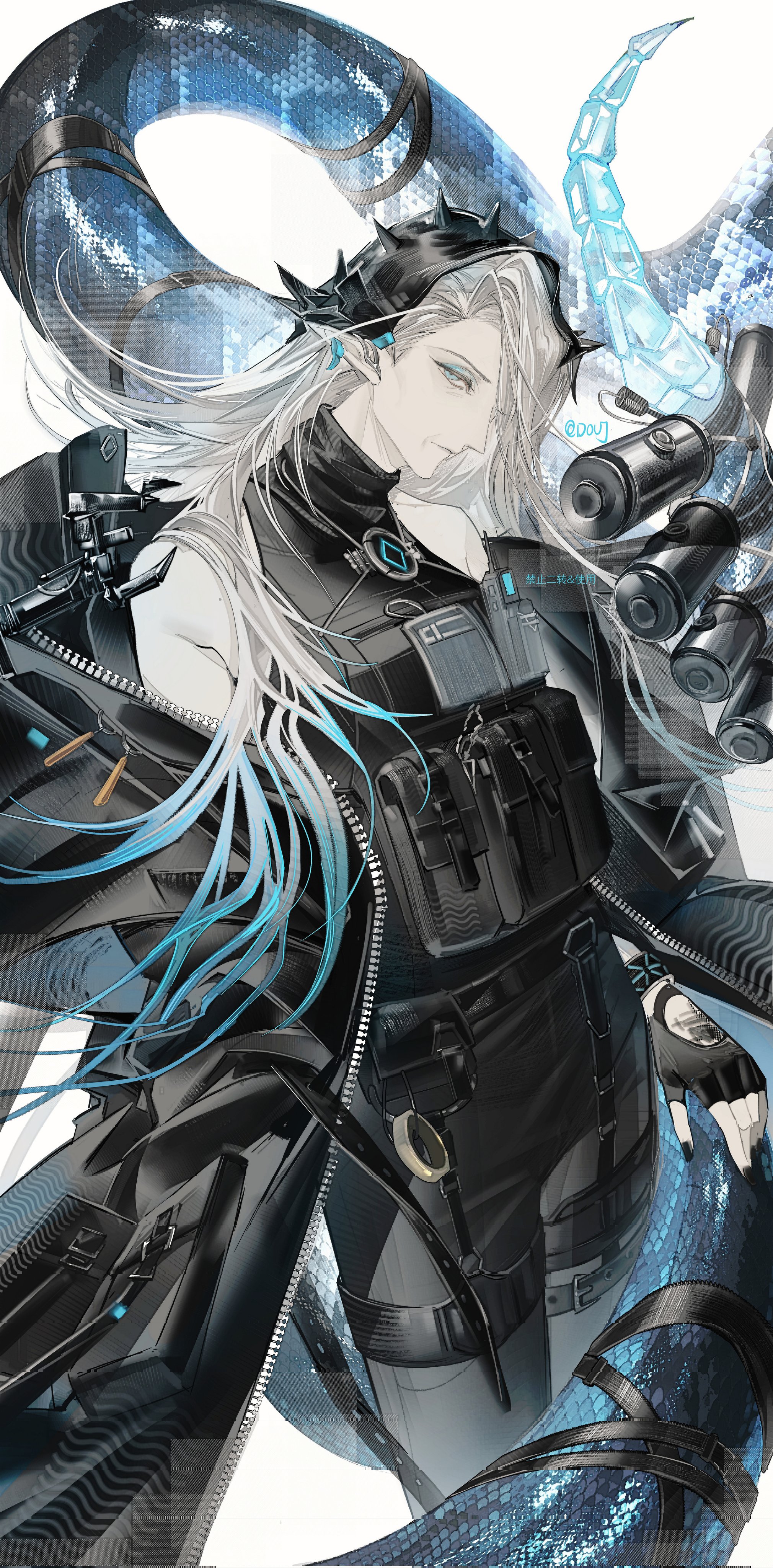 sherman (egnk2525), original, absurdres, highres, 1girl, breasts, brown hair, drone, english text, fingerless gloves, full body, giant, giantess, gloves, gun, handgun, hat, head-mounted display, holding, holding gun, holding staff, holding weapon, large breasts, mecha musume, mechanical dress, nun, shadow, staff, standing, weapon, white background