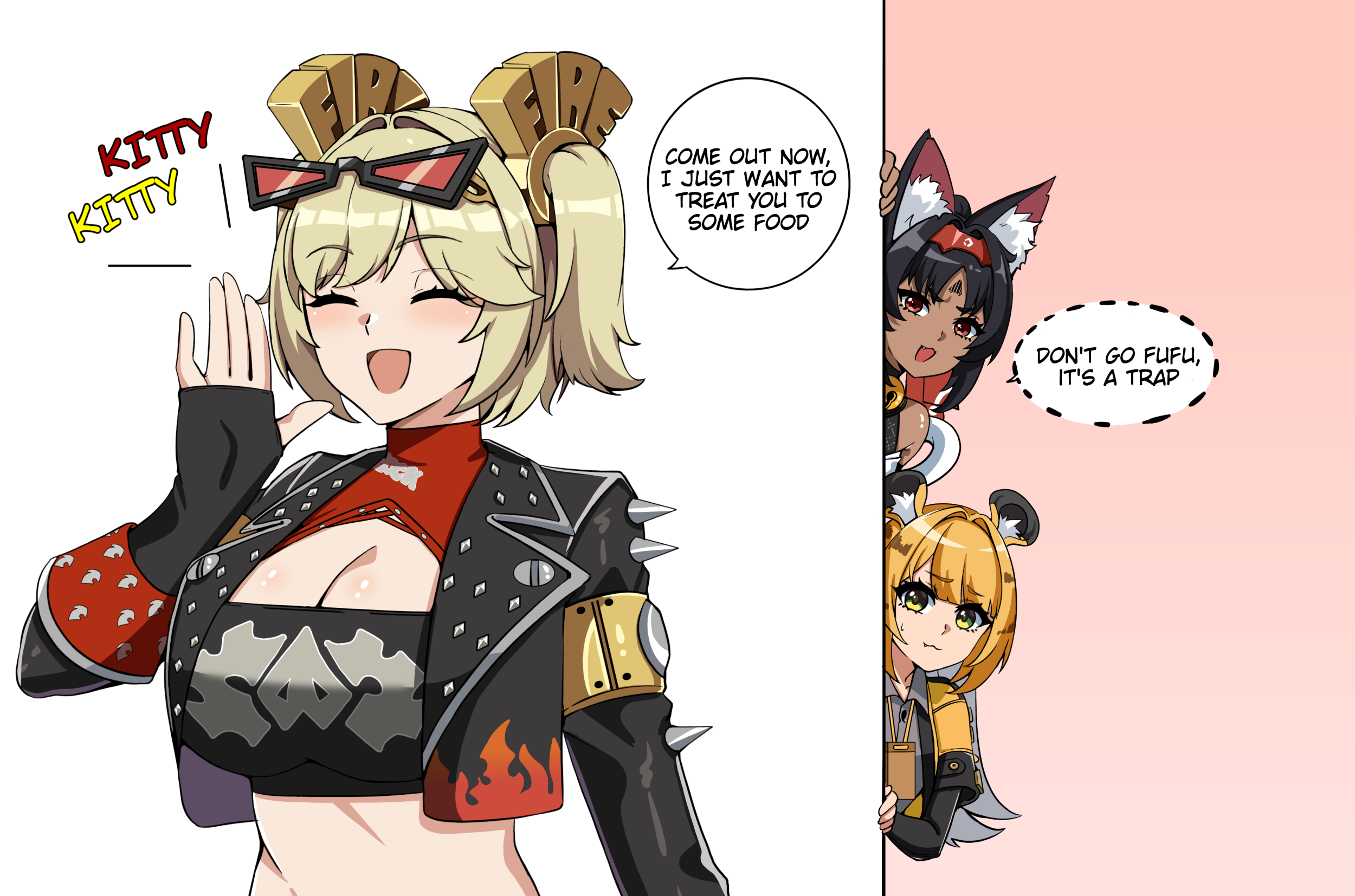 3girlsanimal ear fluffanimal earsblack hairblack jacketblonde hairbreastscat earscat girlcleavagecrop topenglish texteyewear on headglovesjacketmultiple girlsopen mouthred eyesred-tinted eyewearsunglassestiger earstiger girltinted eyeweartwintails