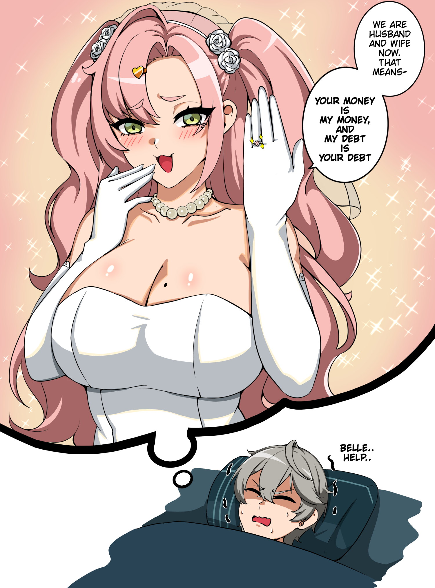 1boy1girlbare shouldersblushbreastsdetached sleevesdreamingdresselbow glovesglovesgreen eyesgrey hairjewelrylong hairlooking at viewermolemole on breastmole under eyenecklacenightmareon bedopen mouthpearl necklacepillowpink hairringshort hairsleepingspeech bubbletwintailswedding dresswedding ringwhite dress