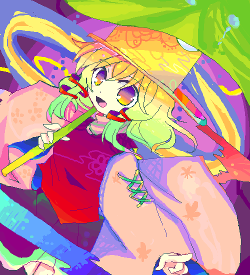 futaba minato, cevio, highres, 1girl, ^ ^, arm behind back, artist name, blue hair, blue ribbon, brown hat, buttons, closed eyes, collared dress, colored inner hair, cowboy shot, dress, flower, hair ornament, hairclip, hand on own chin, hat, hat ornament, long hair, mosaic background, multicolored hair, open mouth, outdoors, ribbon, shade, single sidelock, sleeveless, sleeveless dress, smile, solo, sunflower, watermark, waujyu, white dress