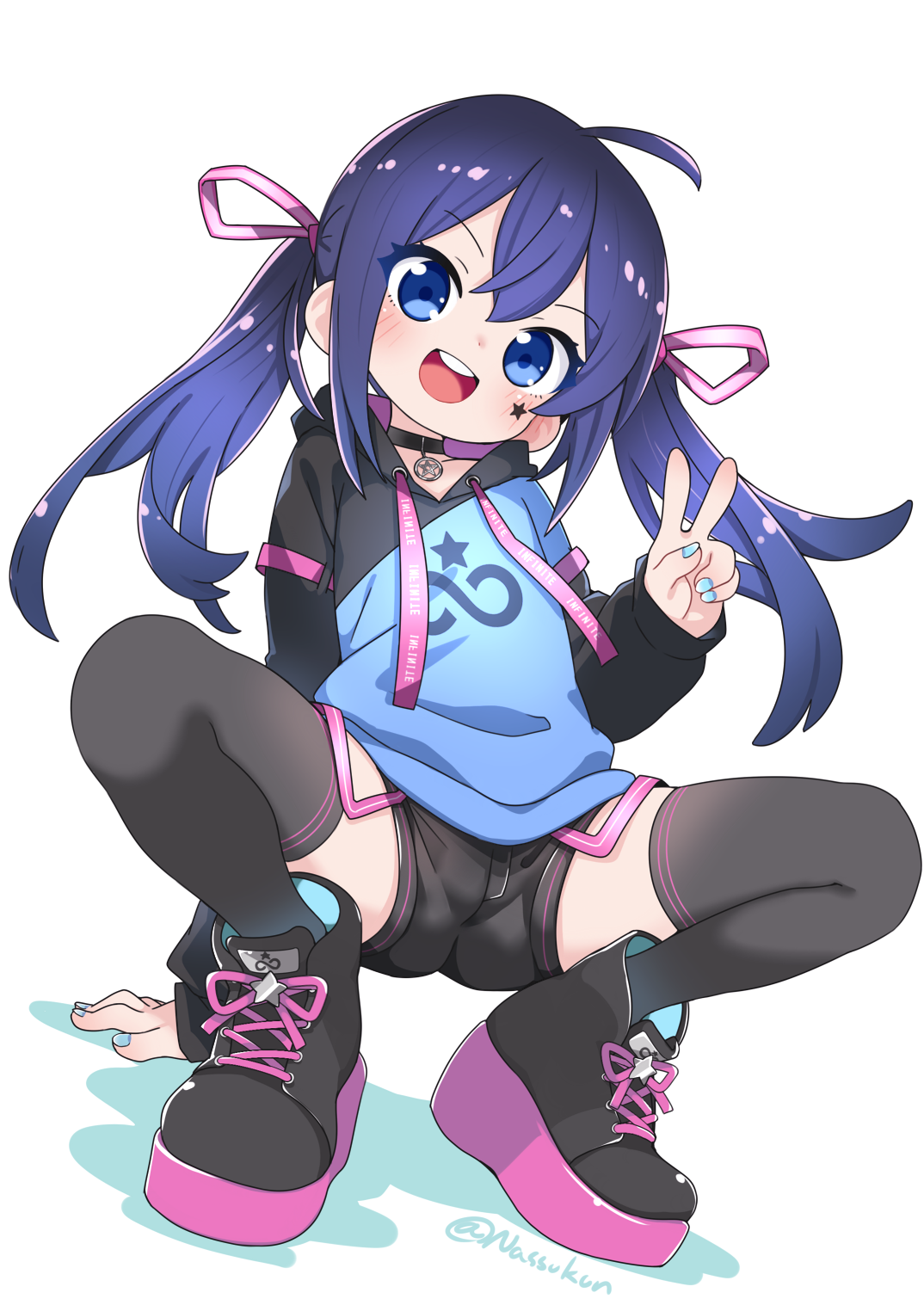 1girlblack shortsblack thighhighsblue eyeshoodlong hairshort shortsshortssmilesolothighhighstwintailsvvirtual youtuberwhite background