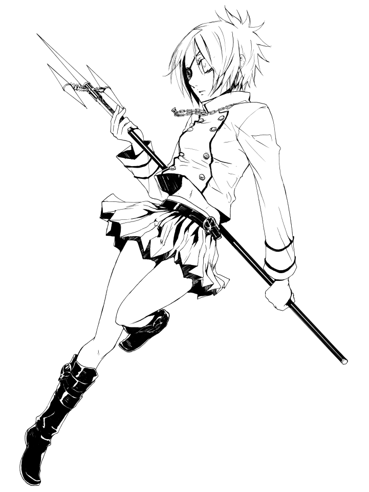00s1girlbootschaineyepatchfemale focusfull bodygreyscalemonochromesimple backgroundskirtsolostaffwhite background