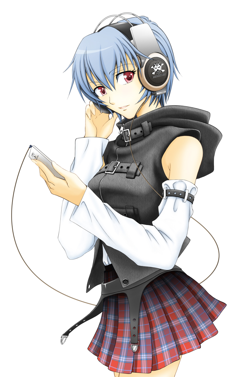 beltblue hairbuckledetached sleevesdigital media playerheadphoneshoodhoodieminiskirtplaid clothesplaid skirtpleated skirtred eyesshort hairsimple backgroundskirtsmilesolovest