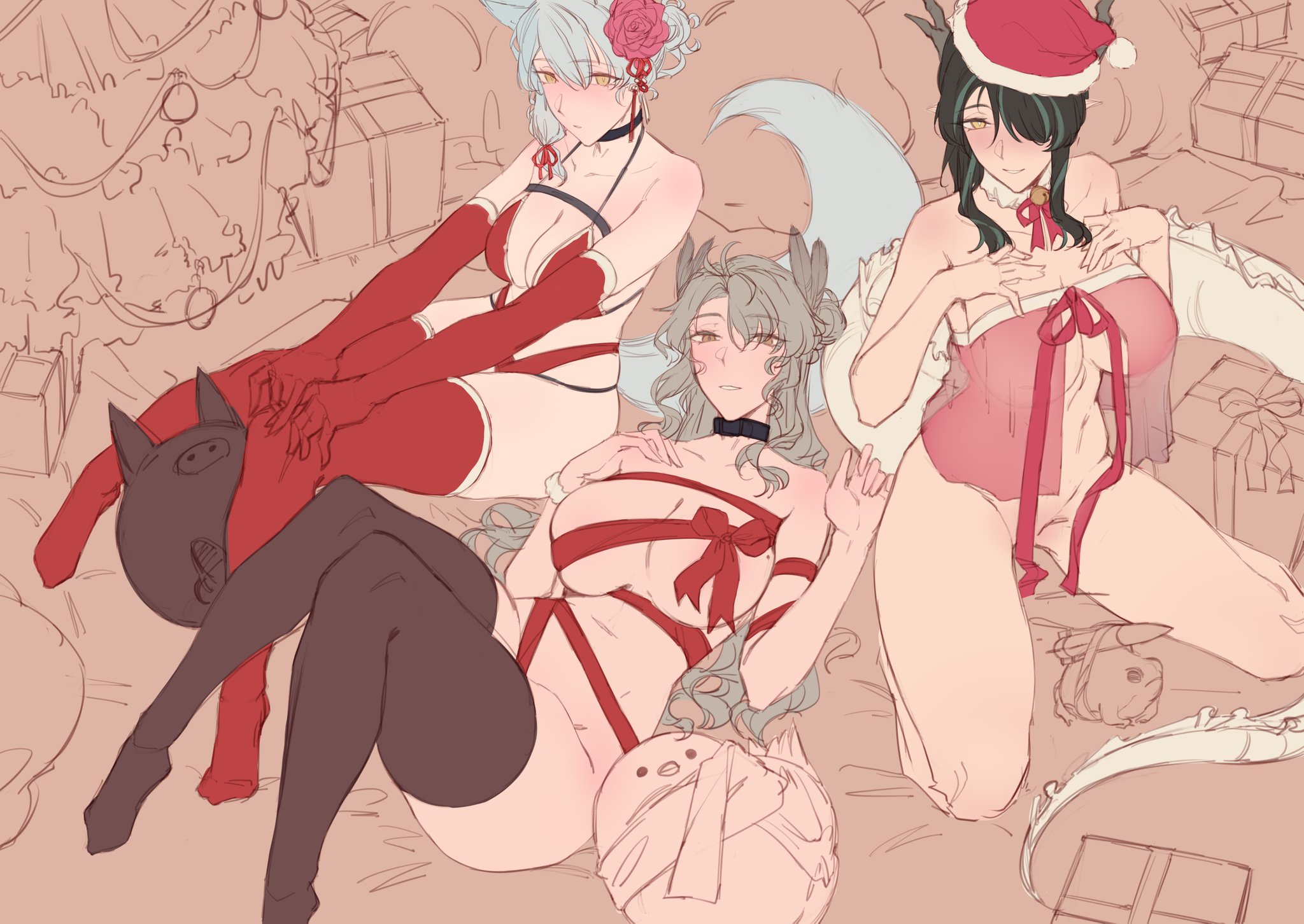 3girlsbellblack thighhighsblue hairbreastsconvenient censoringelbow glovesfeather hair ornamentfeathersgiftglovesgreen hairhair ornamentlarge breastslimited palettemedium breastsmulticolored hairmultiple girlspresentingred thighhighsribbonthighhighsthighsyellow eyes