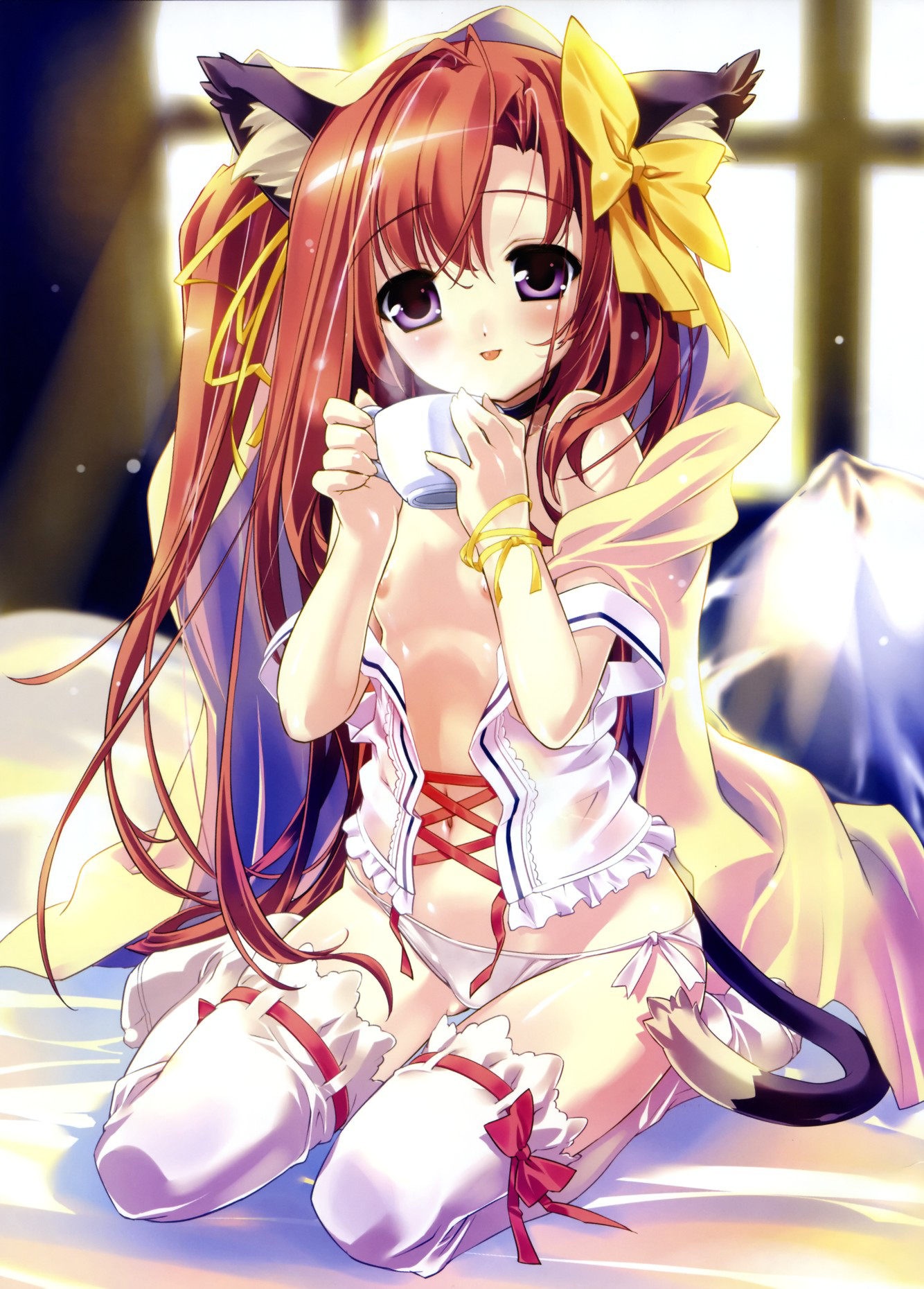 1girlanimal earsblushbowcat earscat tailcupfemale focusflat chesthair bowhair ribbonlong hairmugnipplespantiespurple eyesred hairribbonside-tie pantiessittingsolotailthighhighstwintailsunderwearwarizawhite panties