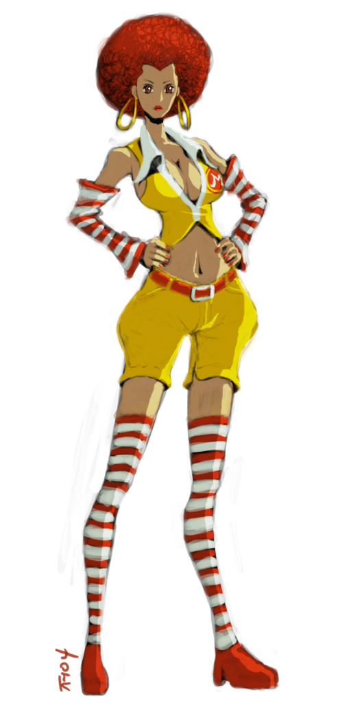 1girlafrobeltbreastscleavagedark skindark-skinned femaledetached sleevesearringsfemale focusgenderswapgenderswap (mtf)jewelrylarge breastslipsnavelred eyesred hairsatireshortssolostriped clothesstriped thighhighsthighhighs