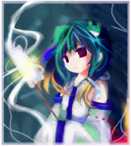 1girlblousecollared shirtdetached sleevesfemale focusfrogglowinggreen hairjapanese clothesmikoshirtsoloupper bodywhite shirt