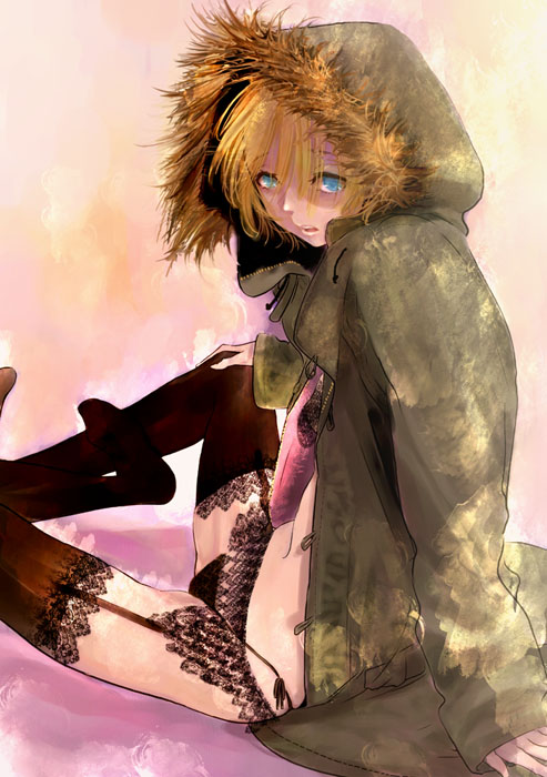 1girlblonde hairblue eyesfemale focusgarter beltgarter strapshoodhoodiejacketlingerieshort hairsolothighhighsunderwear