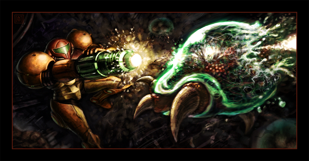 1girlarm cannonarmorenergyenergy beamfangsfiringhelmetpower armorpower suitpower suit (metroid)varia suitweapon