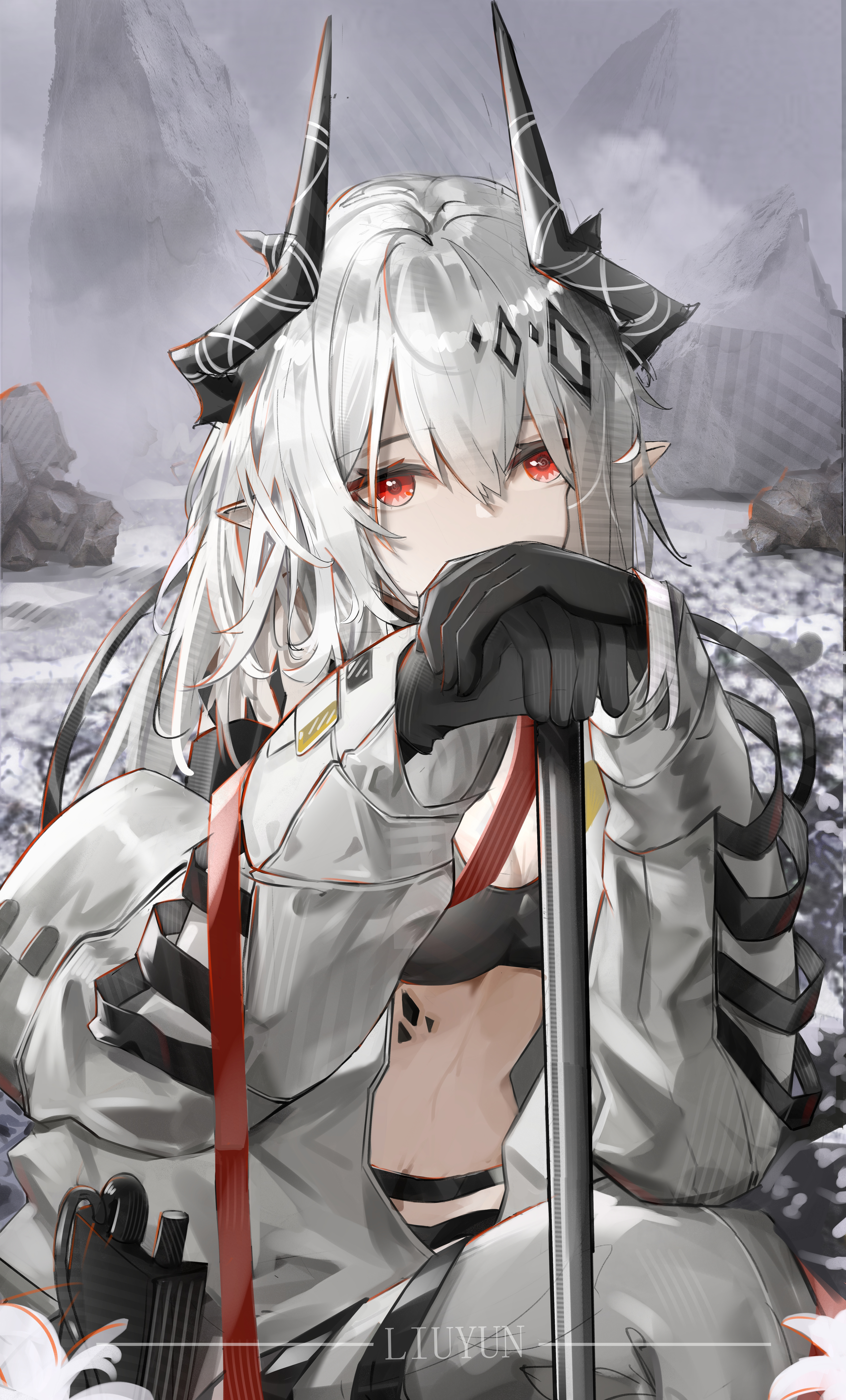 1girlartist nameblack glovesblack hornsbreastscleavagecovered mouthflowergloveshair between eyeshornsjumpsuitliuyunnnnlong hairlong sleeveslooking at viewermaterial growthmedium breastsnaveloripathy lesion (arknights)pointy earsred eyessmokesolowatermarkwhite flowerwhite hair