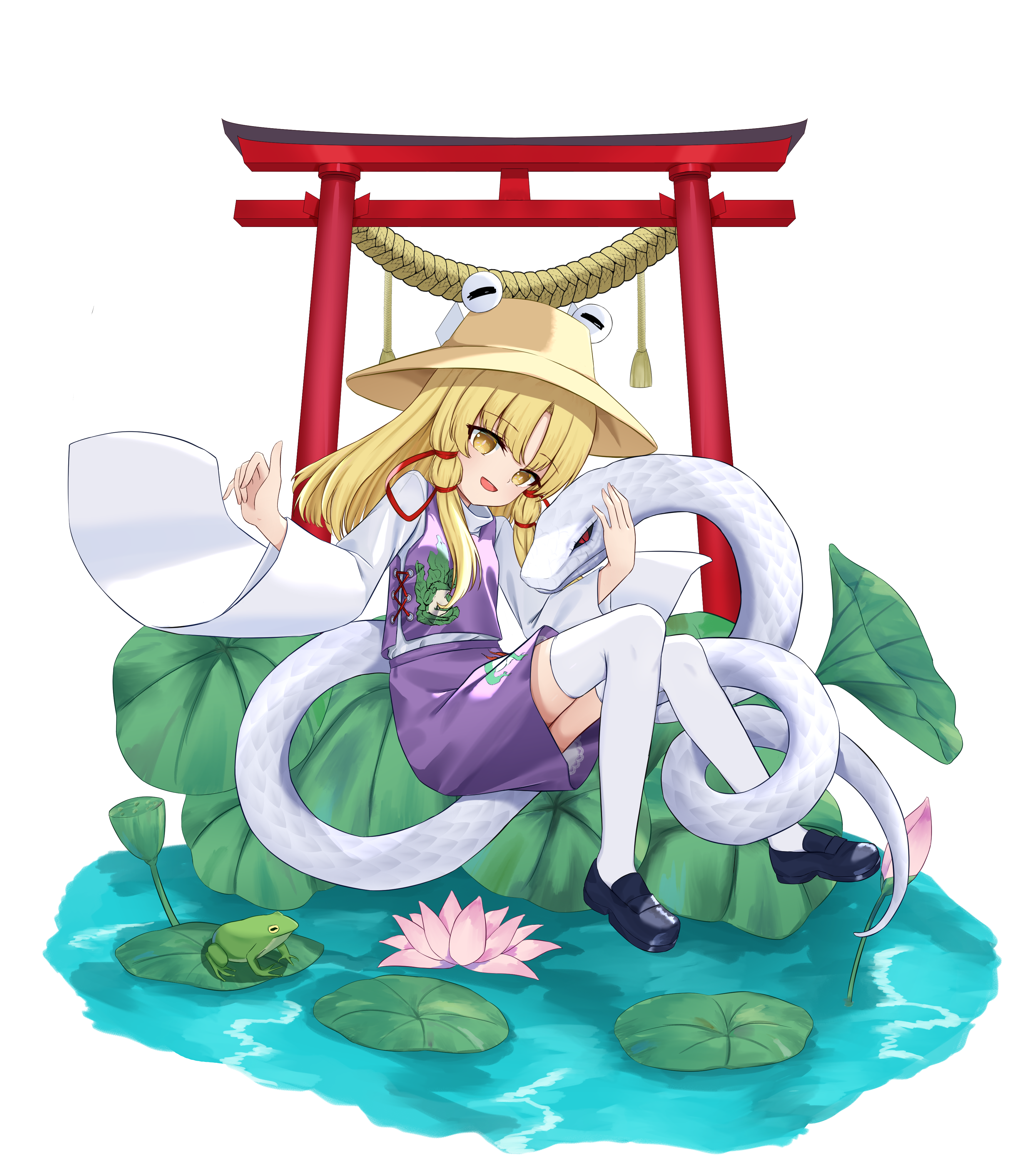 1girlanimal printblonde hairblue shoesbrown hatflowerfrogfrog printhair ribbonhatloaferslong hairlong sleeveslooking at vieweropen mouthpink flowerpurple skirtpurple vestred ribbonribbonshoessimple backgroundskirtskirt setsmilesnakethighhighstoriivestwhite backgroundwhite snakewhite thighhighswide sleevesyellow eyes