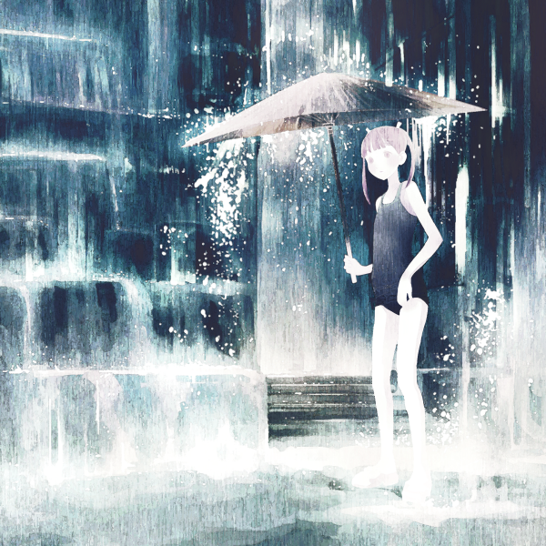1girlfemale focuslegsoil-paper umbrellaone-piece swimsuitrainschool swimsuitshort twintailssolostandingswimsuittwintailsumbrella