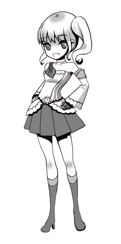 1girlbootsfemale focusfull bodyglovesgreyscalehigh heelsknee bootslacelong hairminiskirtmonochromeshoessimple backgroundskirtsmilesolostandingtwintails