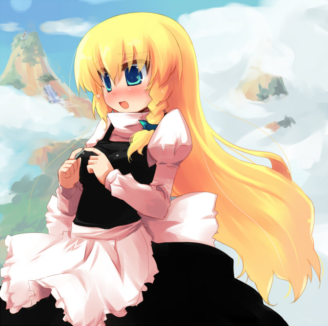 1girlapronblonde hairblue eyesblushbraiddressfemale focushair ribbonlong hairnatureoutdoorsplantribbonskysolovery long hair