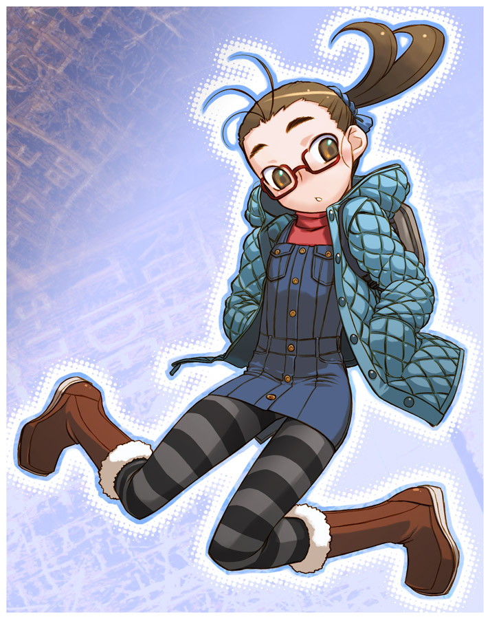 1girlbackpackbagblack pantyhosebootsbrown bootsbrown eyesbrown hairdressfemale focusflat chestforeheadfull bodyfur trimglassesoutlinepantyhosepatterned legwearponytailquilted jacketrandoserured-framed eyewearsemi-rimless eyewearsolostriped clothesstriped pantyhoseturtleneck