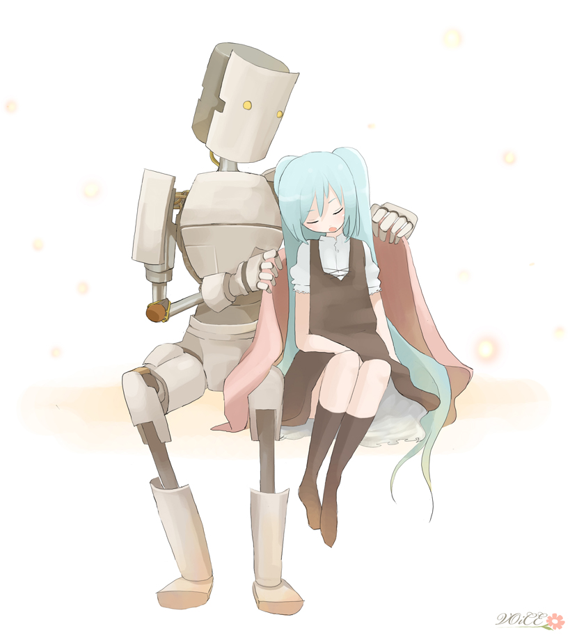 black socksblanketdressinvisible chairkneehighsleaning to the sidelong hairrobotsittingsleepysockssong nametwintailsvery long hairwhite background