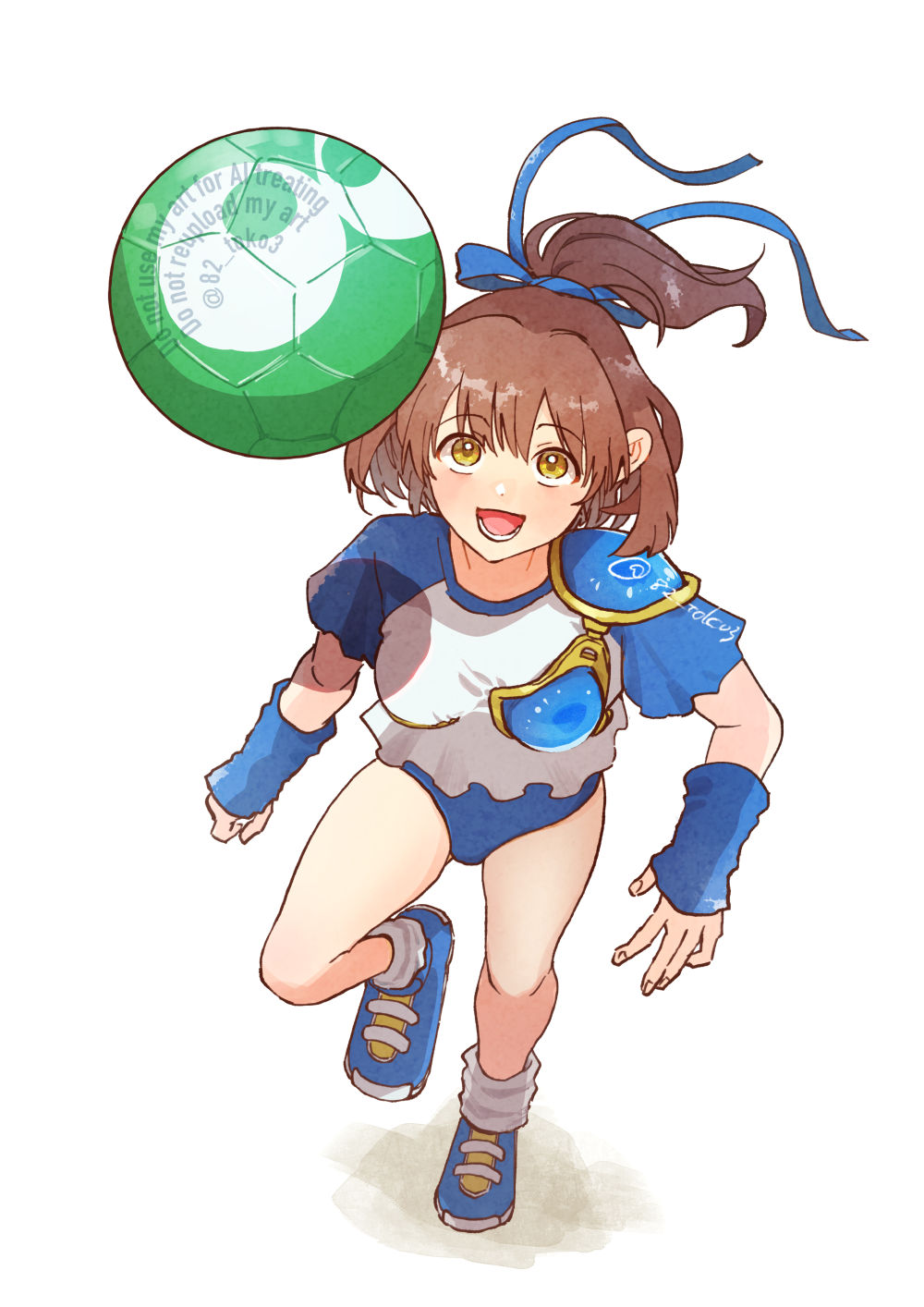 1girl82 toko3ankle socksarm warmersarmorballblue ribbonbreastsbrown eyesbrown hairburumalooking at objectmedium breastsopen mouthribbonshoesshort hairshoulder armorsidelockssimple backgroundsneakerssoccer ballsockssolotwo-tone shirtvolleyball (object)watermark