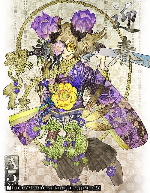 1girlbrown hairbugbutterflyclawseyepatchfemale focusflowerglasseshair ornamentholdingholding behind backholding swordholding sword behind backholding weaponholding weapon behind backinsectjapanese clotheskimonopointy earsshort hairsmilesoloswordwatermarkweapon
