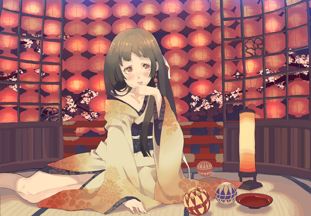 1girlballblushbrown eyescherry blossomscupfemale focusjapanese clotheskimonolanternlong hairlyingpaper lanternsakazukisittingsolotatamitemari ballyokozuwari