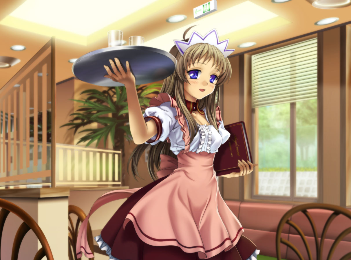 rasukaru, silver hair, adjusting hair, brown eyes, long hair, ponytail, skirt, smile, solo