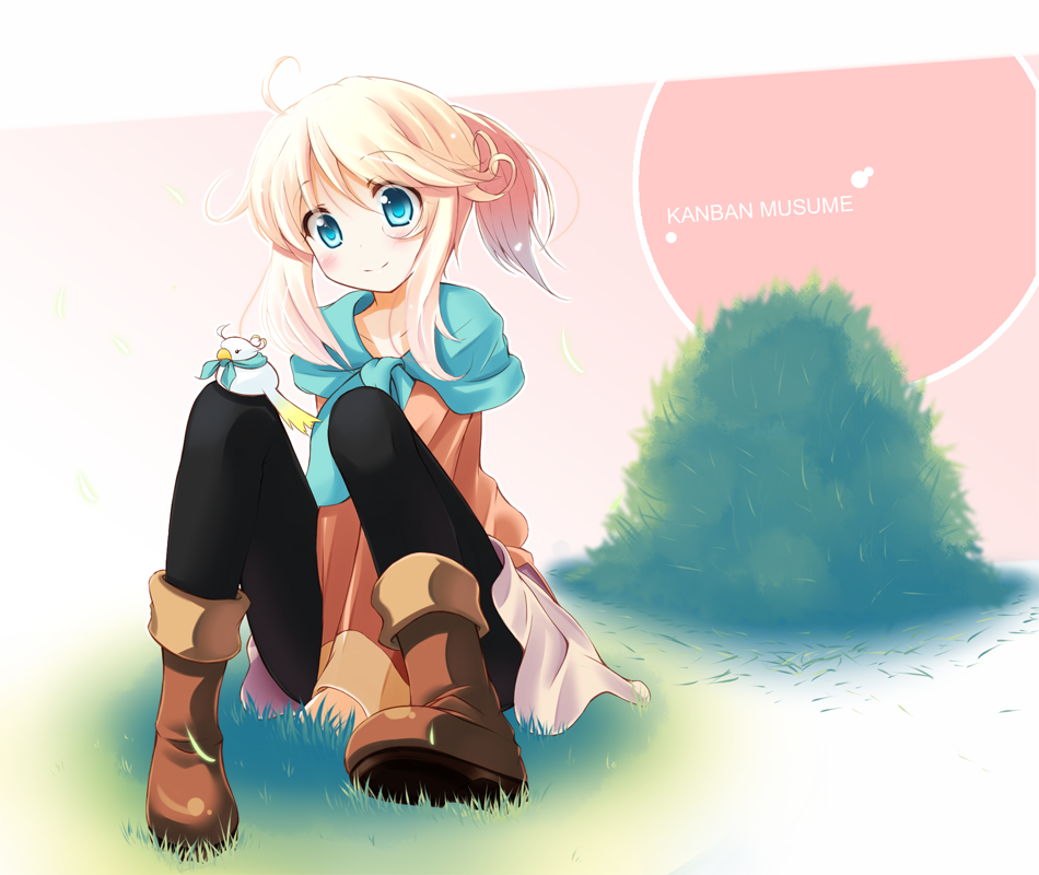 1girlbirdblack pantyhoseblonde hairblue eyesblushbootsfemale focusgrasspantyhosepink hairponytailshort hairsittingsmilesolov arms