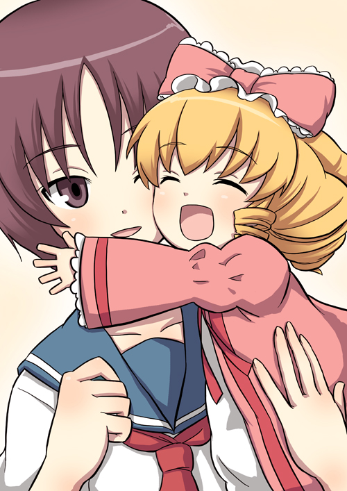 00s2girlsblonde hairblue sailor collarblushbowbrown hairdrill hairhappyhugmultiple girlspink bowsailor collarschool uniform