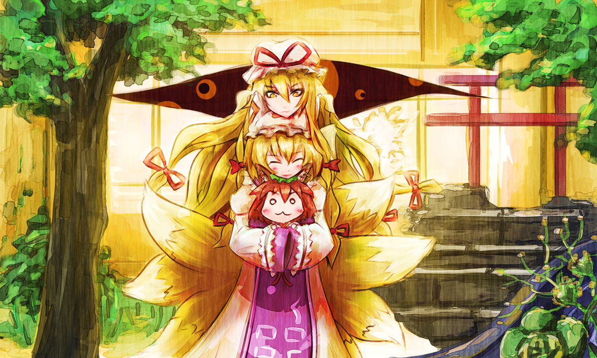guozimiao, kochiya sanae, moriya suwako, yasaka kanako, touhou, absurdres, highres, 4girls, arm up, bare shoulders, blonde hair, body writing, bow, breasts, building, closed eyes, closed mouth, detached sleeves, dress, dual persona, frog hair ornament, green eyes, green hair, hair ornament, hair tubes, imminent hand holding, looking at another, multiple girls, offering hand to another, open mouth, purple hair, reaching, reaching towards another, red bow, red sun, school uniform, serafuku, skirt, snake hair ornament, sun, tearing up, tears, white background, white sleeves, wide sleeves