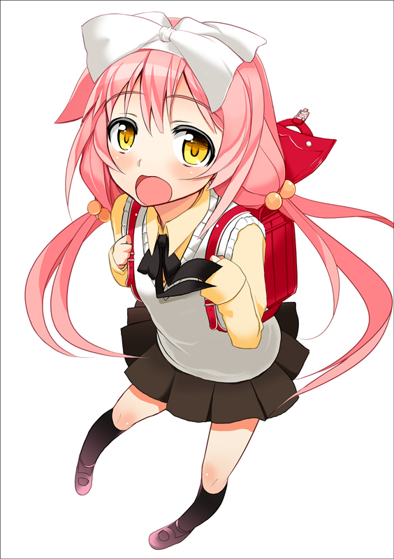 :o1girlbackpackbagblack socksblushbody blushborderbowbucklefemale focusflat chestforeshorteningfrom abovefull bodyhair bobbleshair bowhair ornamenthair ribbonkneehighslong hairlong sleeveslooking at viewerlow twintailsmary janesneck ribbonopen mouthpink hairpleated skirtrandoseruribbonshirtshoessimple backgroundskirtsleeves past wristssockssolostandingsweatersweater vesttwintailsvery long hairwhite backgroundwing collaryellow eyes
