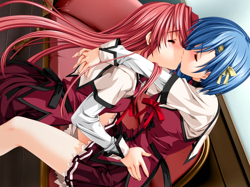 annierosaart, exusiai (arknights), exusiai the new covenant (arknights), fiammetta (arknights), arknights, commentary request, highres, 2girls, anger vein, artist name, black jacket, blush, breasts, cross, cross earrings, earrings, english text, halo, head wings, indoors, jacket, jewelry, large breasts, multiple girls, necktie, open mouth, red eyes, red hair, red necktie, red wings, shirt, short hair, side ponytail, thighhighs, white shirt, white thighhighs, wings, yellow eyes, yuri
