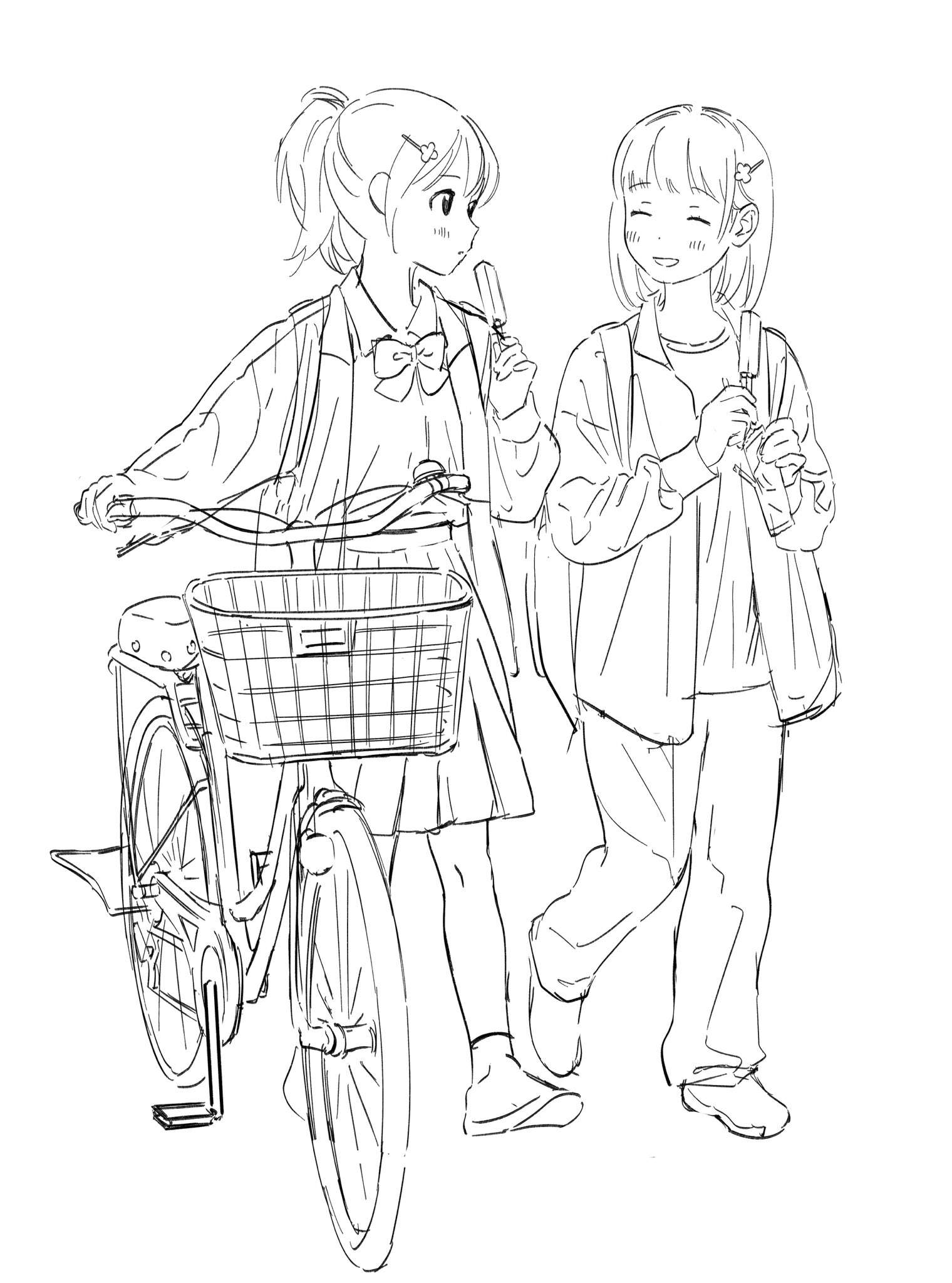 :d2girlsbagbicyclebowclosed eyesfoodgreyscalehair ornamenthairclipjacketlong sleevesmonochromemultiple girlsopen mouthpleated skirtponytailschool uniformshoesskirtsmilesocks