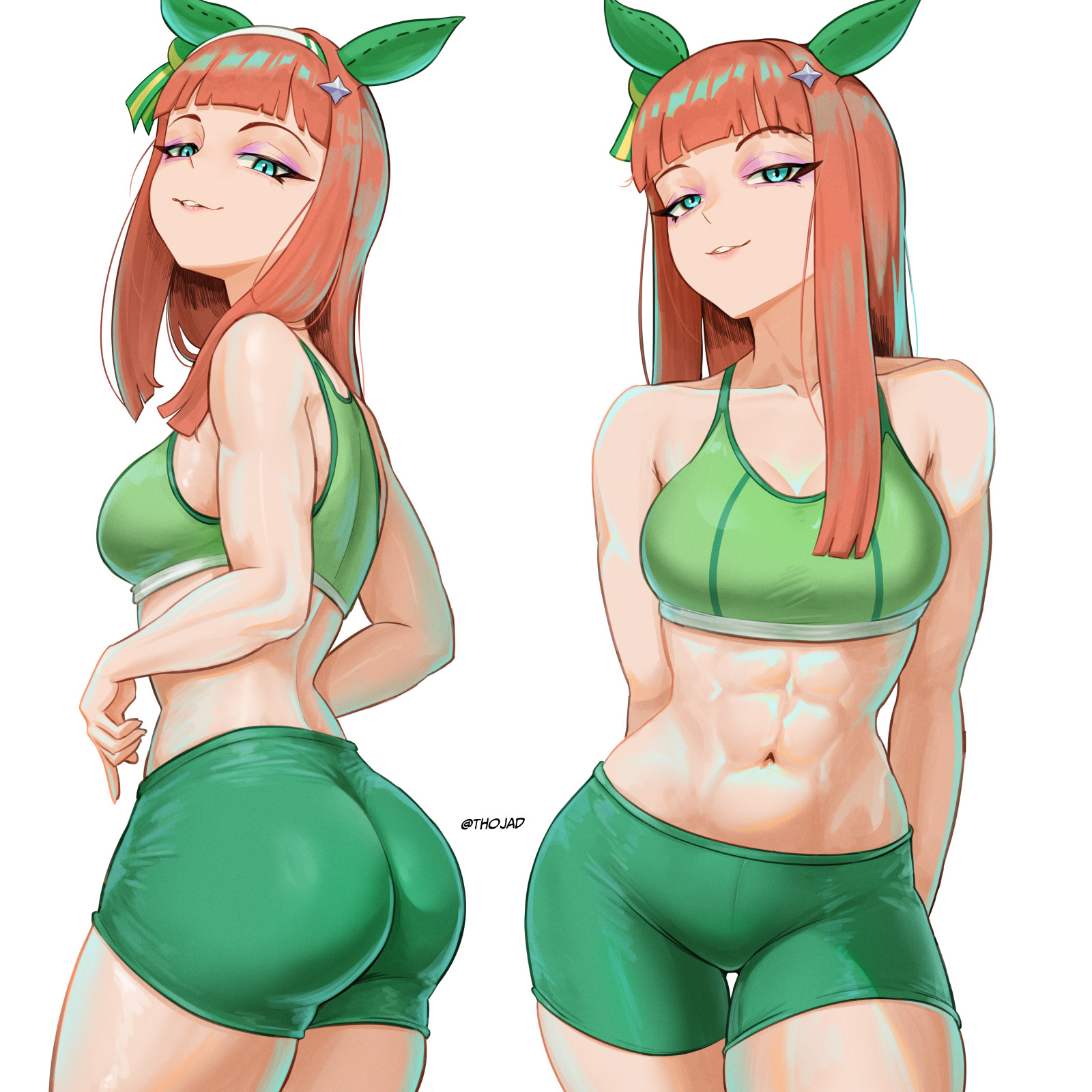 1girlabsassbike shortsblunt bangsbreastsgreen shortshime cutlong hairlooking at viewermakeupmedium breastsmidriffmultiple viewsorange hairshortssidelockssmilesportswearthighsthojadtonedtoned femalewhite background