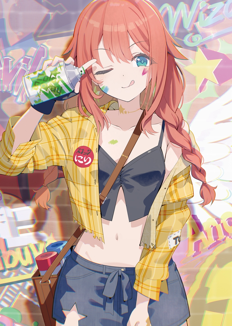 :q1girlbagblue eyesblue shortsbraidbreastsbrown bagcamisolecollarbonecowboy shotcrop topgraffitiholdingjacketlong hairlong sleeveslooking at viewermidriffnavelone eye closedopen clothespaint on clothespaint splatterpaint splatter on faceplaid clothesplaid shirtshirtshortsshoulder bagsmilesolospray cantonguetongue outtwin braidsvirtual youtuberyellow jacketyellow shirt