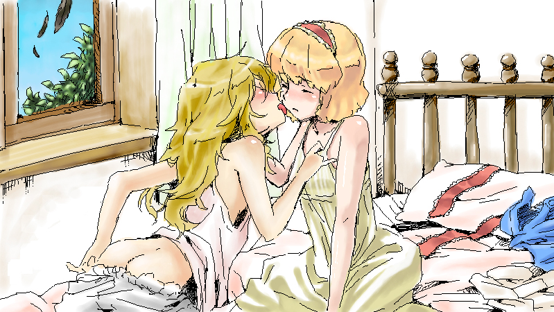 2girlsassbedblonde hairbloomersblushfeathersfemale focushairbandlickingmultiple girlsoekakitongueunderwearundressingwindowyuri