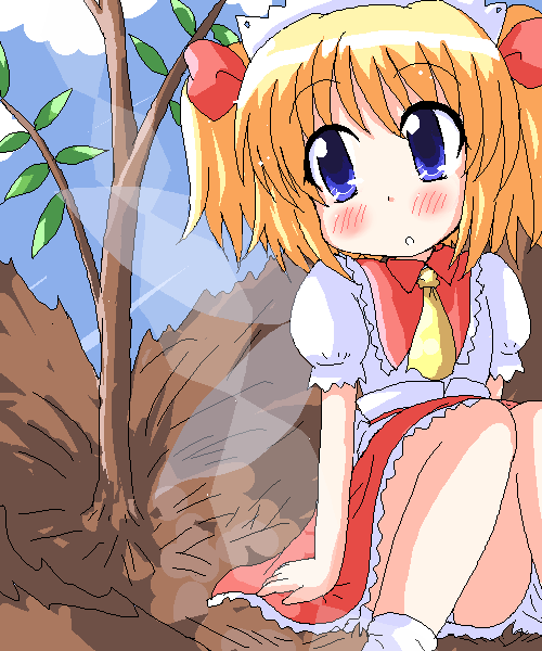 1girlblonde hairblue eyesfairyfemale focushair ribbonoekakioutdoorspantiesribbonsittingskysolotreetwintailstwo side upunderwearwings
