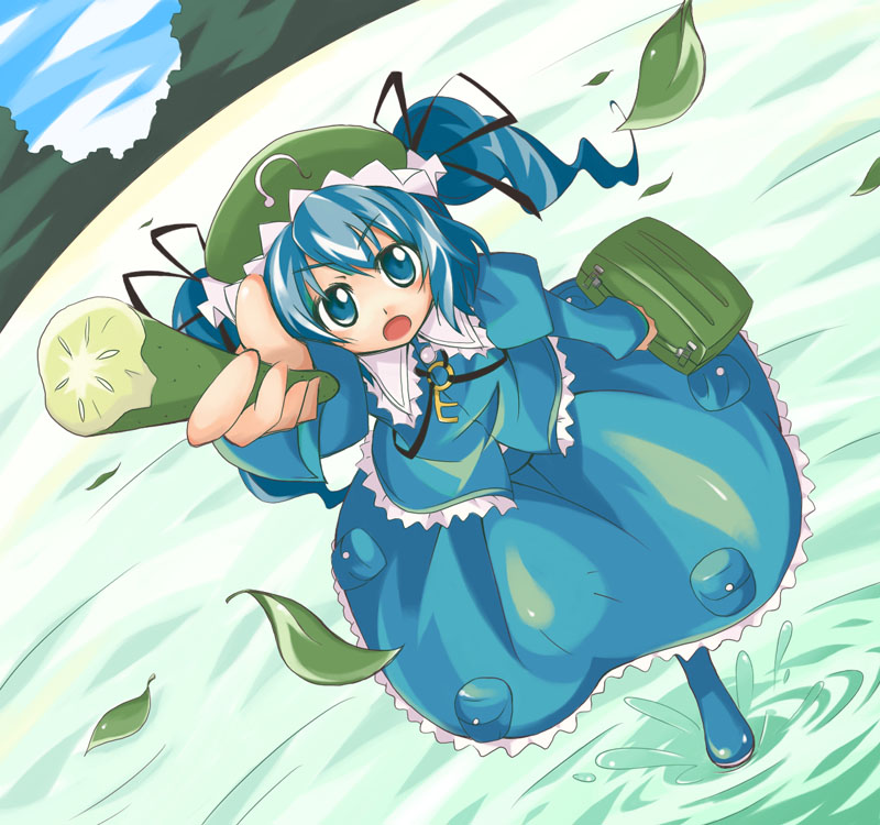 1girlblue eyesblue haircucumberfemale focuskeyleafmatching hair/eyesribbonsolosplashingtwintailstwo side up