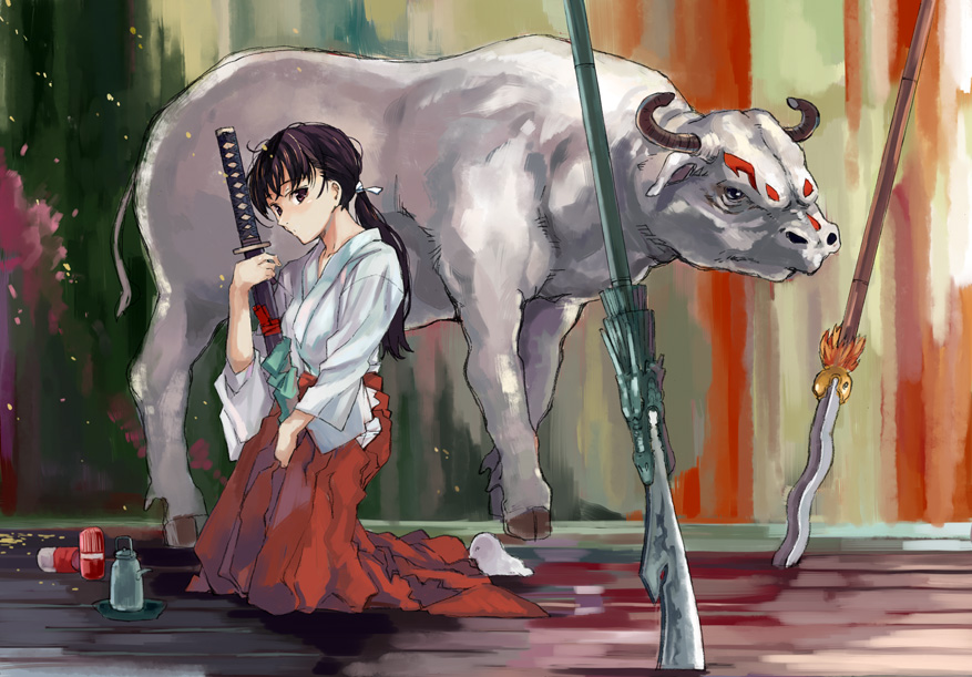 sesmkun, eternity larva, fujiwara no mokou, hakurei reimu, houraisan kaguya, shiki eiki, tatara kogasa, toyosatomimi no miko, touhou, highres, 6+girls, blonde hair, blue hair, blush, bow, brown hair, closed mouth, frills, green hair, hat, heart, hime cut, long hair, long sleeves, looking at viewer, multiple girls, pink hair, pink shirt, puffy sleeves, red bow, shirt, smile, umbrella, very long hair