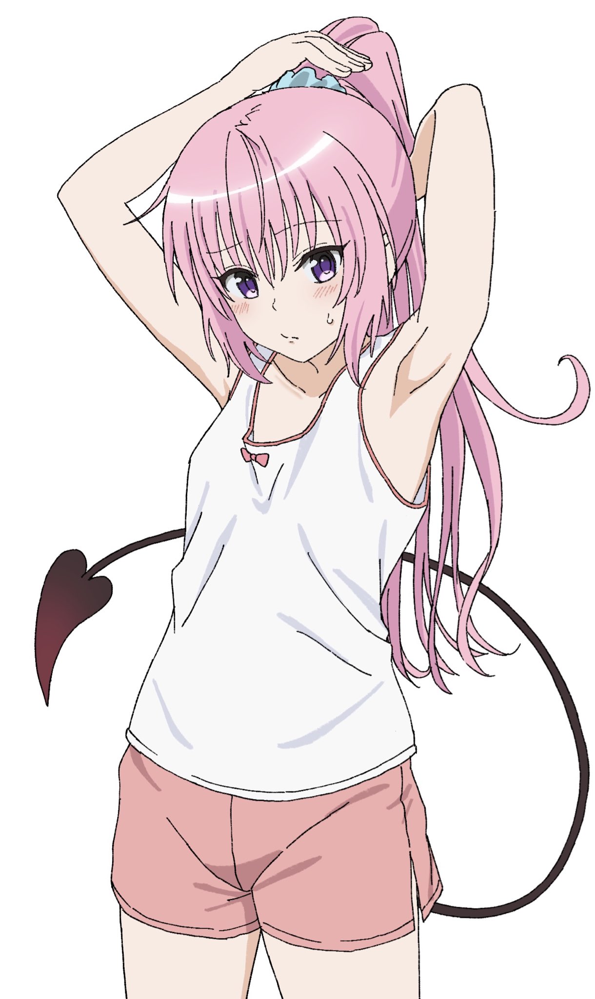 1girlbare shouldersblushbreastsdemon tailfurrowed browlong hairlooking at viewerpink eyespink hairpurple eyesshort shortsshortsshysmall breastssolotailtwintailsvest