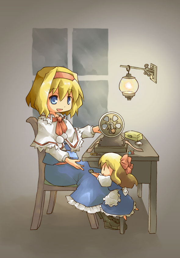 1girlblonde hairblue eyesdollfemale focushairbandindoorsribbonsewing machineshort hairsolowindow