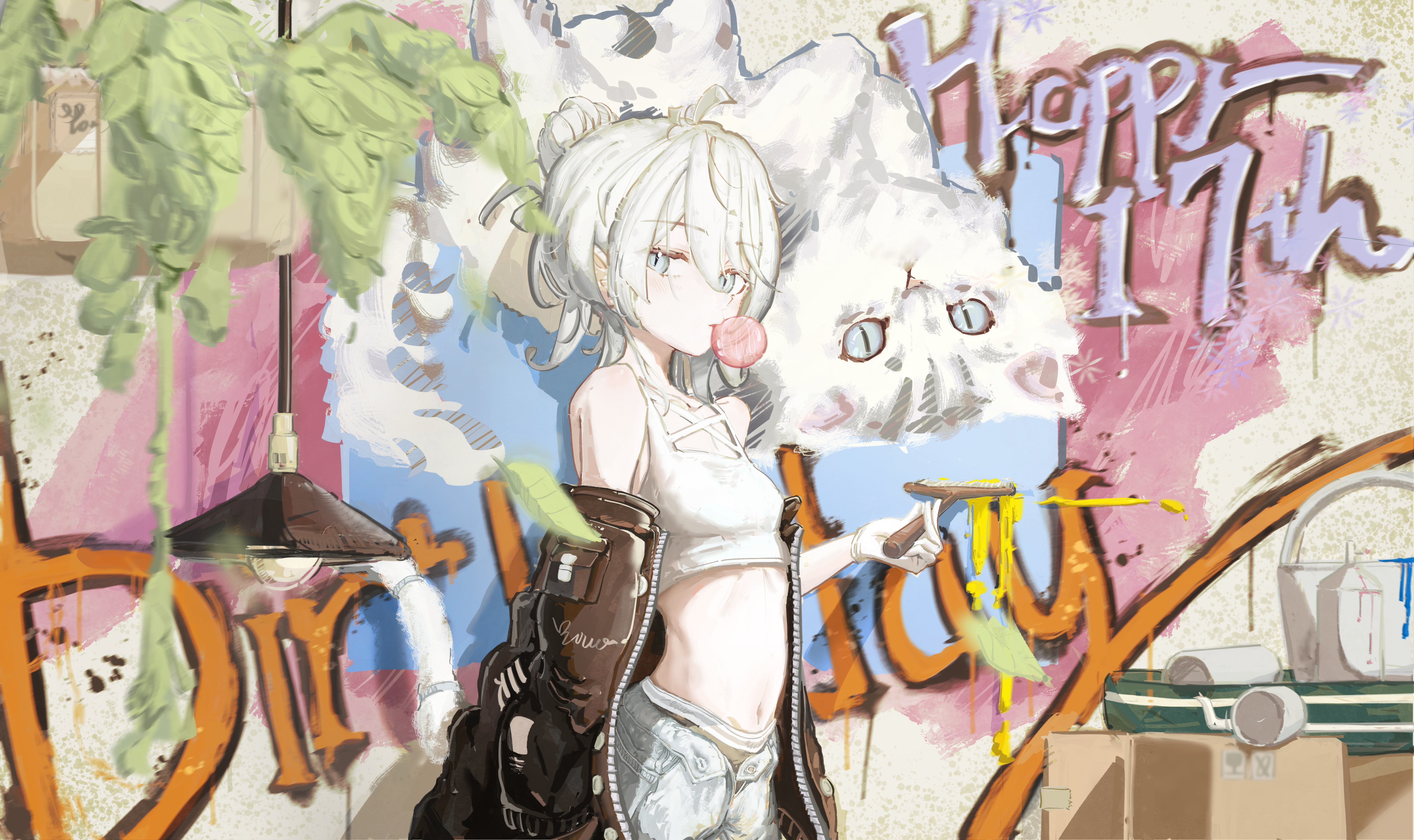 1girlahogearm at sideblack jacketblack pantiesblowing bubble gumcatchewing gumcowboy shotcrop topcropped shirtdenimfrom sidegraffitigrey eyesgrey hairgrey shirthair between eyeshair bunhand uphanging lighthanging plantholdingholding brushjacketjacket partially removedjeanslong bangslooking at viewernavelopen flyopen pantspaint rollerpaintbrushpainting (action)pantiespantsparted lipsshirtsleevelesssleeveless shirtslit pupilssolostandingstomachunderwearunzipped